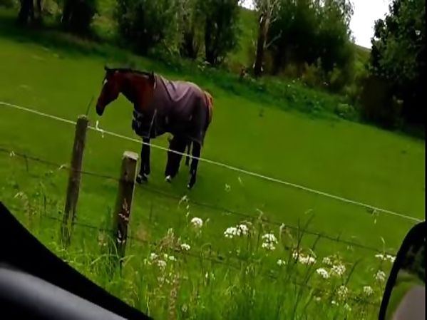 UN CHEVAL BOUGE LA TÊTE DANS UN CHAMP EN ÉCOUTANT LA CHANSON « I'M BROKEN »