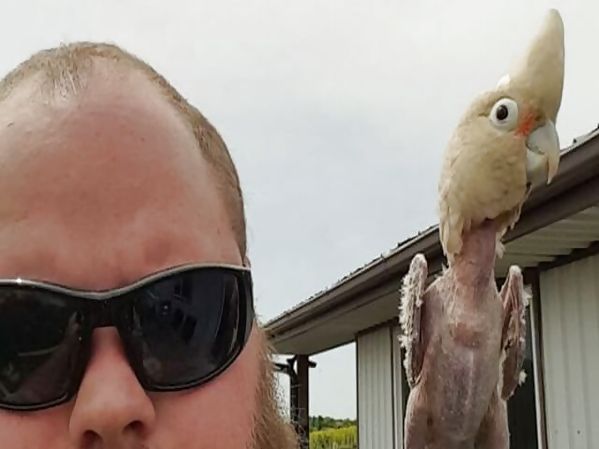 UNE PERRUCHE PARTIELLEMENT DÉPLUMÉE DANSE SUR L'ÉPAULE DE SON PROPRIÉTAIRE