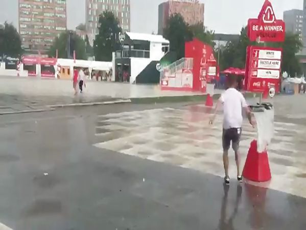 UN SUPPORTER ANGLAIS S'AMUSE SOUS LA PLUIE