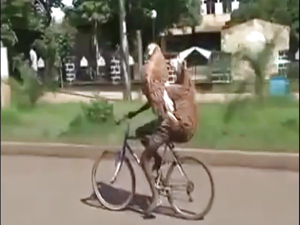 UN HOMME SE DÉPLACE TRANQUILLEMENT AVEC DEUX MOUTONS SUR LA BICYCLETTE