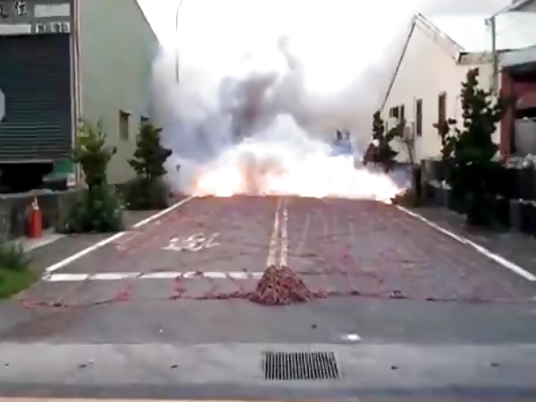 UNE TRADITION CONSISTE À RECOUVRIR UNE RUE DE PÉTARDS ET À TOUT FAIRE EXPLOSER (TAÏWAN)