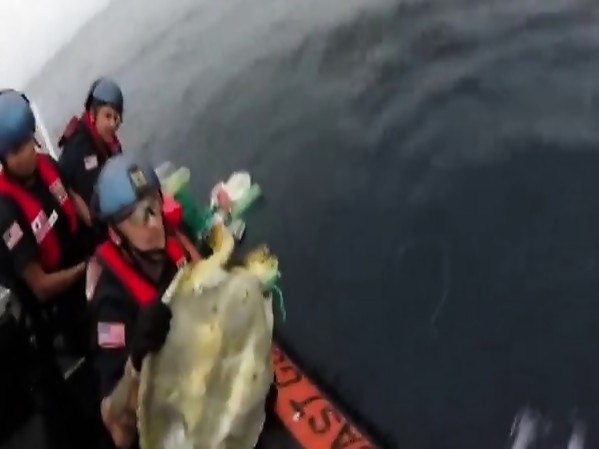 ILS LIBÈRENT DEUX TORTUES D'UN FILET DE PÊCHE (AU LARGE DES CÔTES DE L'AMÉRIQUE CENTRALE)