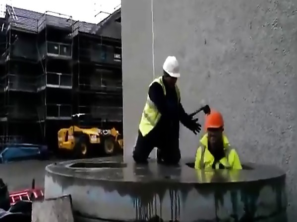 TROIS OUVRIERS JOUENT AU JEU DE LA TAUPE SUR UN CHANTIER