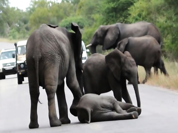 UN ÉLÉPHANTEAU EST TOMBÉ SUR LA ROUTE ET N’ARRIVE PAS À SE RELEVER (AFRIQUE DU SUD)