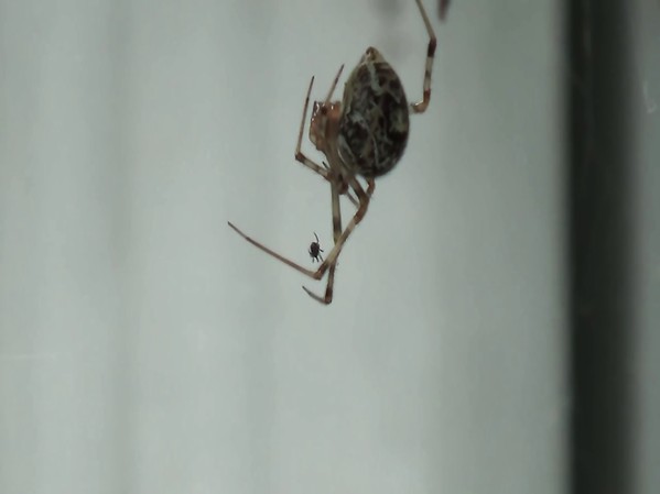 UNE PETITE ARAIGNÉE SE PROMÈNE SUR LA PATTE D'UNE GROSSE ARAIGNÉE QUI DORT