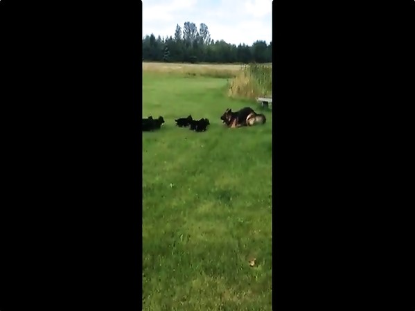 UNE CHIENNE DE RACE BERGER ALLEMAND JOUE AVEC SES CHIOTS DANS L'HERBE