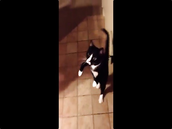 FREEBS LE CHAT PREND UNE DRÔLE DE POSTURE POUR ATTRAPER UN MORCEAU DE VIANDE