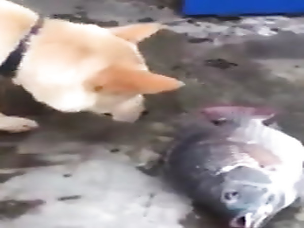 UN CHIEN S’EST RETROUVÉ FACE À DES POISSONS HORS DE L’EAU ET VA TOUT FAIRE POUR LES SAUVER EN LEUR JETANT DE L’EAU SUR EUX