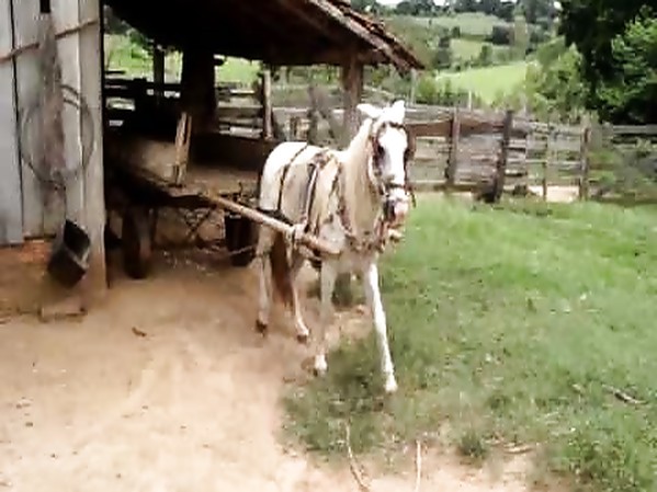 UN CHEVAL ATTELÉ À UNE CHARRETTE FAIT UNE MANOEUVRE EN MARCHE ARRIÈRE POUR SE GARER SOUS UN HANGAR