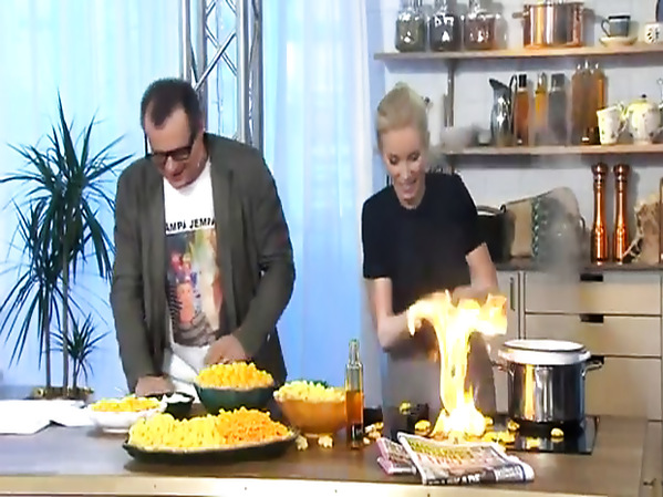 EN SUÈDE, DURANT L'ÉMISSION DE CUISINE NYHETSMORGON DE LA CHAÎNE TV4, LA JOURNALISTE ET PRÉSENTATRICE JENNY STRÖMSTEDT DÉCLENCHE UN PETIT INCENDIE