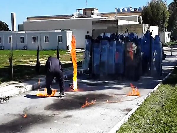 À SAFI, LORS DE L'ENTRAINEMENT ANTI-TERRORISTE DES FORCES ARMÉES DE MALTE, UN HOMME DOIT JETER UN COCKTAIL MOLOTOV SUR LA BRIGADE AFM