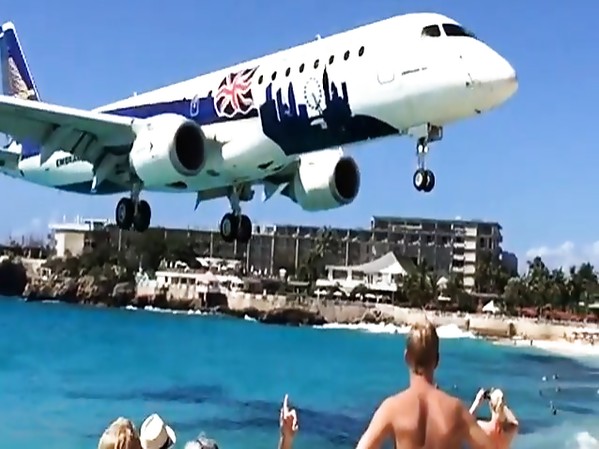 UN ATTERRISSAGE FILMÉ AU RALENTI D'UN AVION DE LIGNE SUR LA PLAGE DE MAHO BEACH DE L'ÎLE DE SAINT MARTIN
