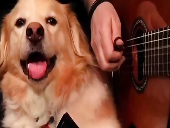 TANDIS QUE SON MAÎTRE JOUE DE LA GUITARE, UN CHIEN L'ACCOMPAGNE EN FRAPPANT SUR UNE CLOCHE AVEC UNE BAGUETTE