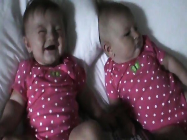 UN BÉBÉ FAIT DU BRUIT AVEC SA BOUCHE CE QUI FAIT BEAUCOUP RIRE SA SOEUR JUMELLE
