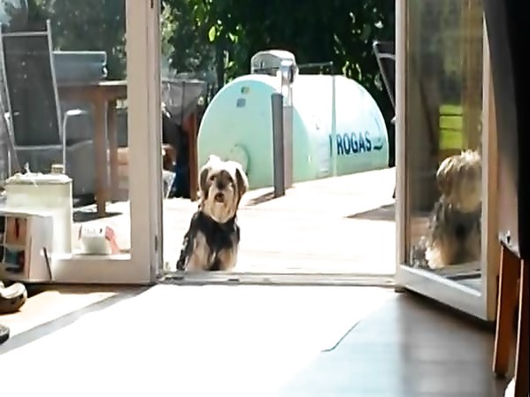 CHIEN RESTE DEHORS SUR LA TERRASSE, CAR IL PENSE QUE LA PORTE-FENÊTRE EST FERMÉE