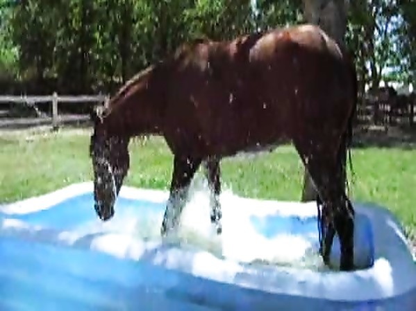 CHEVAL PREND SON BAIN DANS LA PISCINE DES ENFANTS