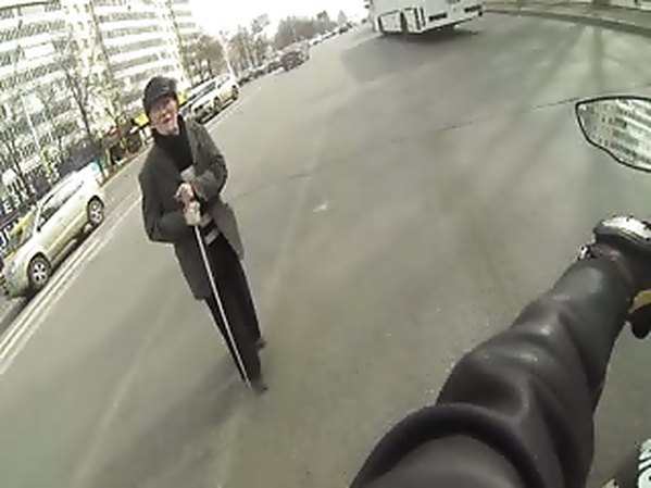 MOTARD AIDE UN VIEIL HOMME À TRAVERSER