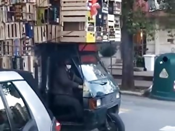 UN TRICYCLE MOTORISÉ SURCHARGÉ FAIT DES ROUES ARRIÈRE