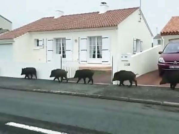 DES SANGLIERS EN FILE INDIENNE DANS UNE RUE