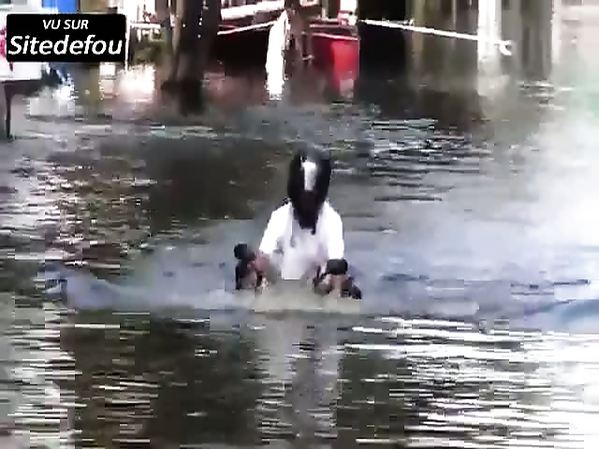 IL ROULE EN MOTO AVEC DE L'EAU JUSQU'AUX ÉPAULES