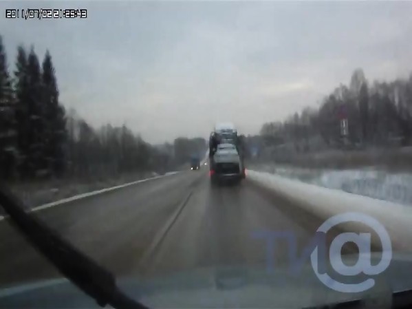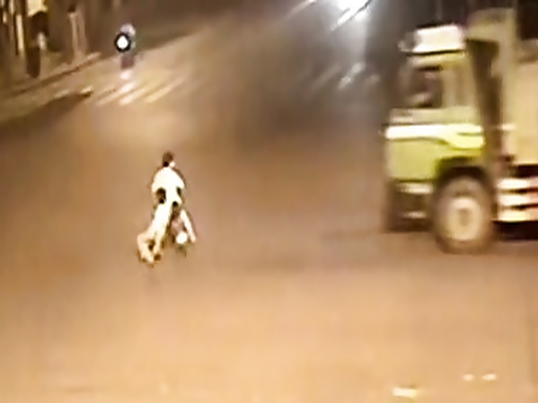 UN PASSAGER SUR UN SCOOTER TOMBE ET PASSE JUSTE SOUS UN CAMION