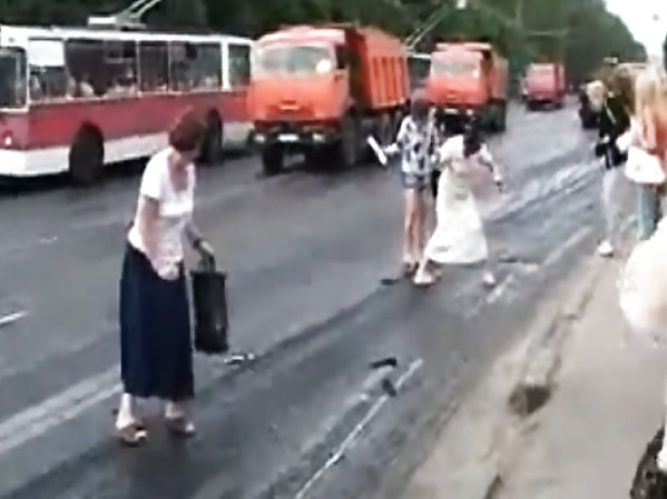 DES RUSSES MARCHENT SUR UNE ROUTE FRAÎCHEMENT GOUDRONNÉE